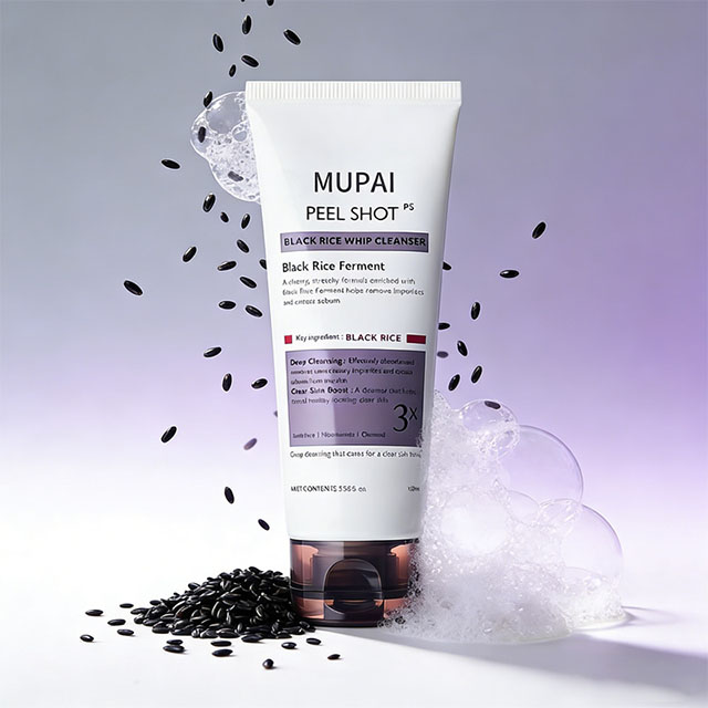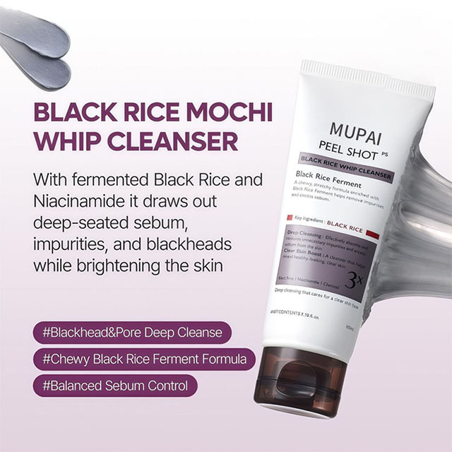 Black Rice Mochi Whip Cleanser is a rich, chewy cleansing foam formulated with fermented black rice extract, niacinamide, green clay, and LHA to deeply cleanse pores, remove impurities, and improve overall skin clarity. Its unique mochi-like whip texture creates dense micro-foam that gently lifts away deep-seated sebum, dirt, and blackheads without stripping the skin’s natural moisture barrier.